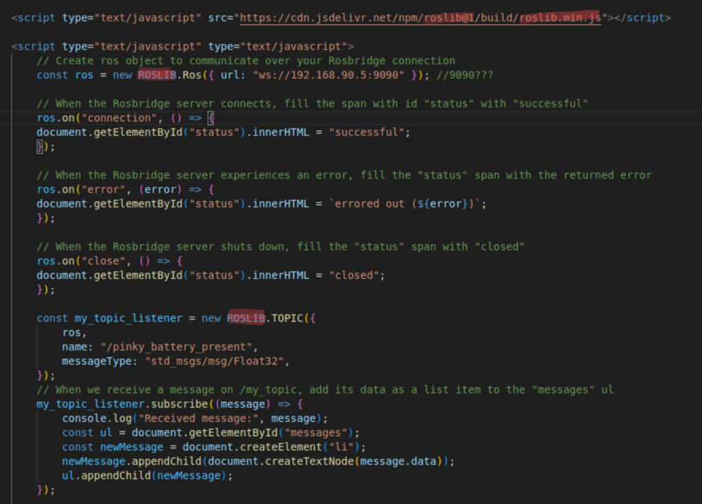 2. .html 파일 안에 roslibjs를 사용해 web socket 연결해준다.