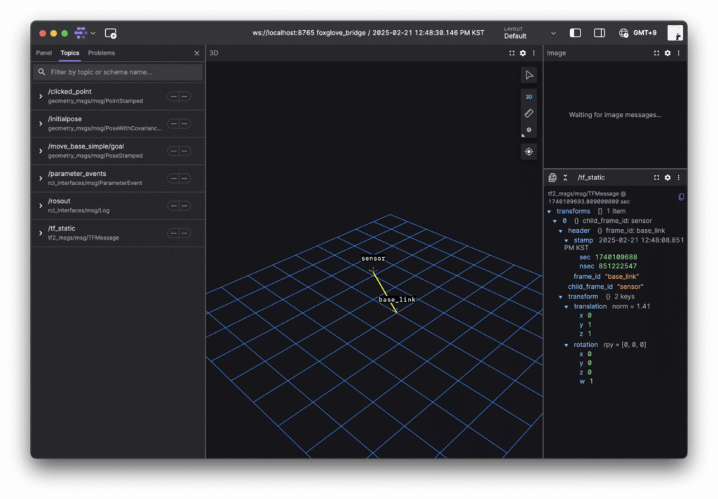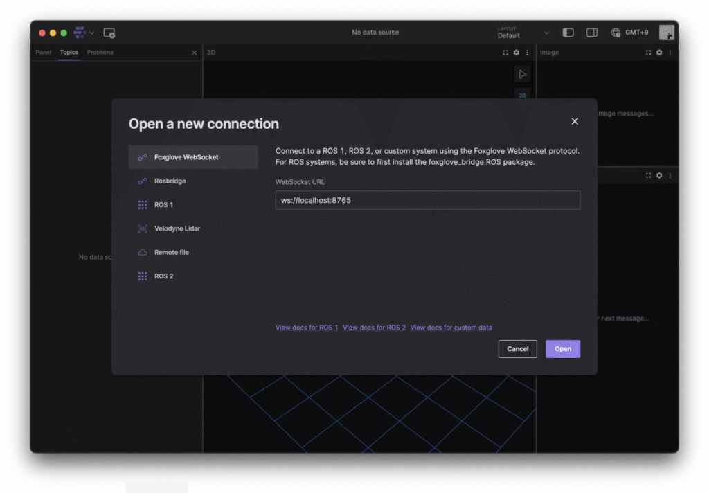 foxglove에서 Local로 Port번호 8765를 사용하는 ROS 통신을 다 받아올 것이다.